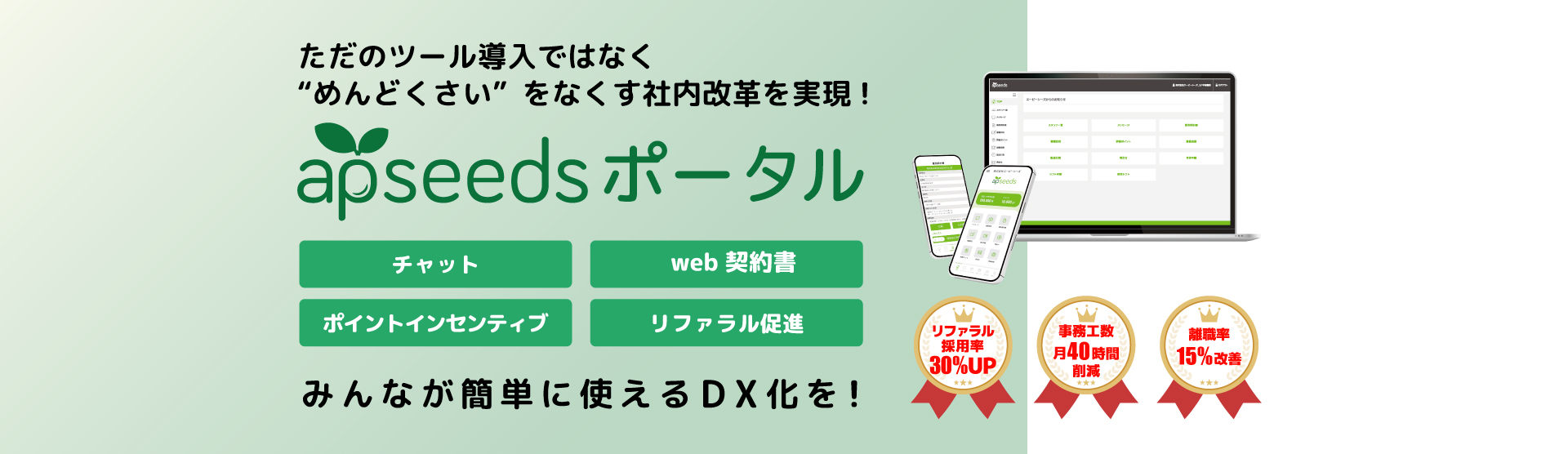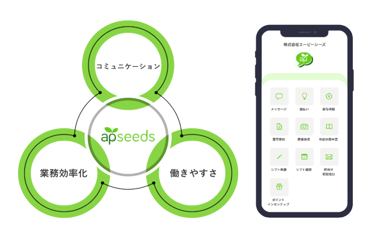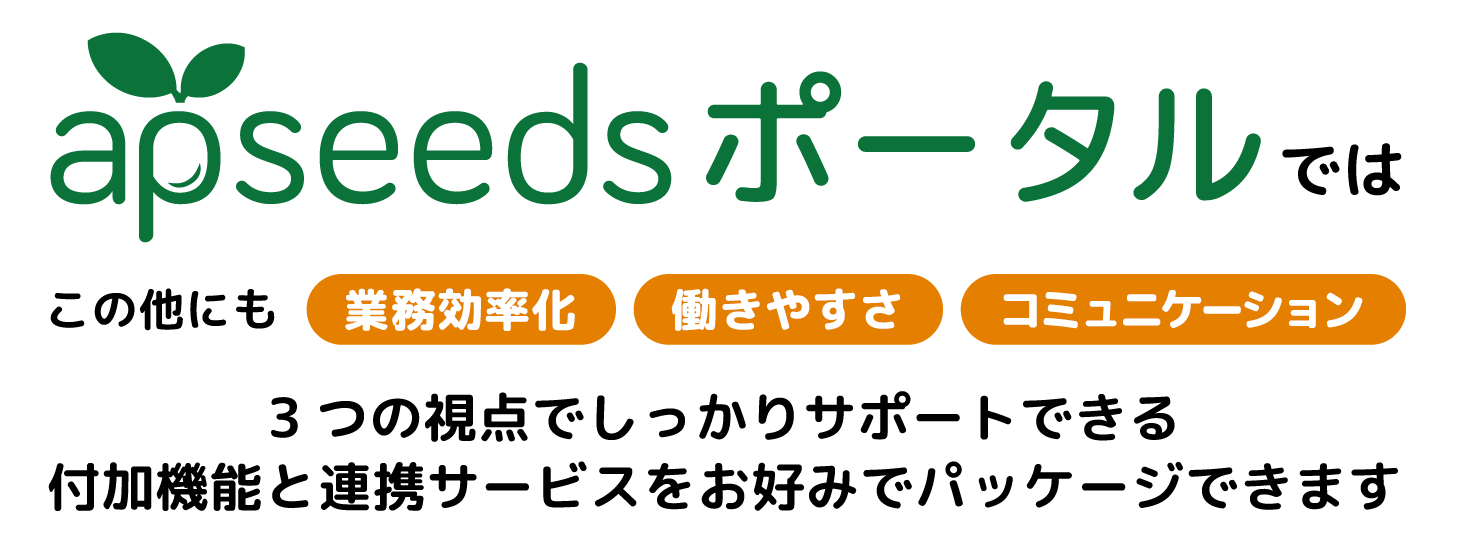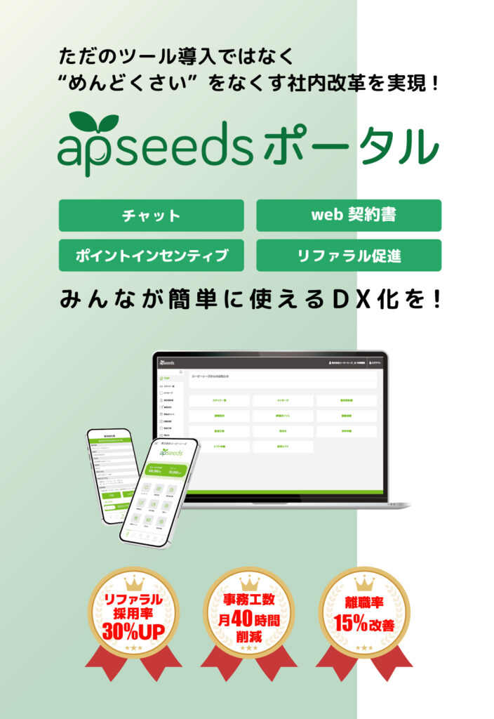 お知らせ・マニュアル・届出書など今お使いの書類と運用をそのまま電子化し、スマホアプリ『apseedsポータル』やwebブラウザでの配布・回収・管理を可能にするサービスです。