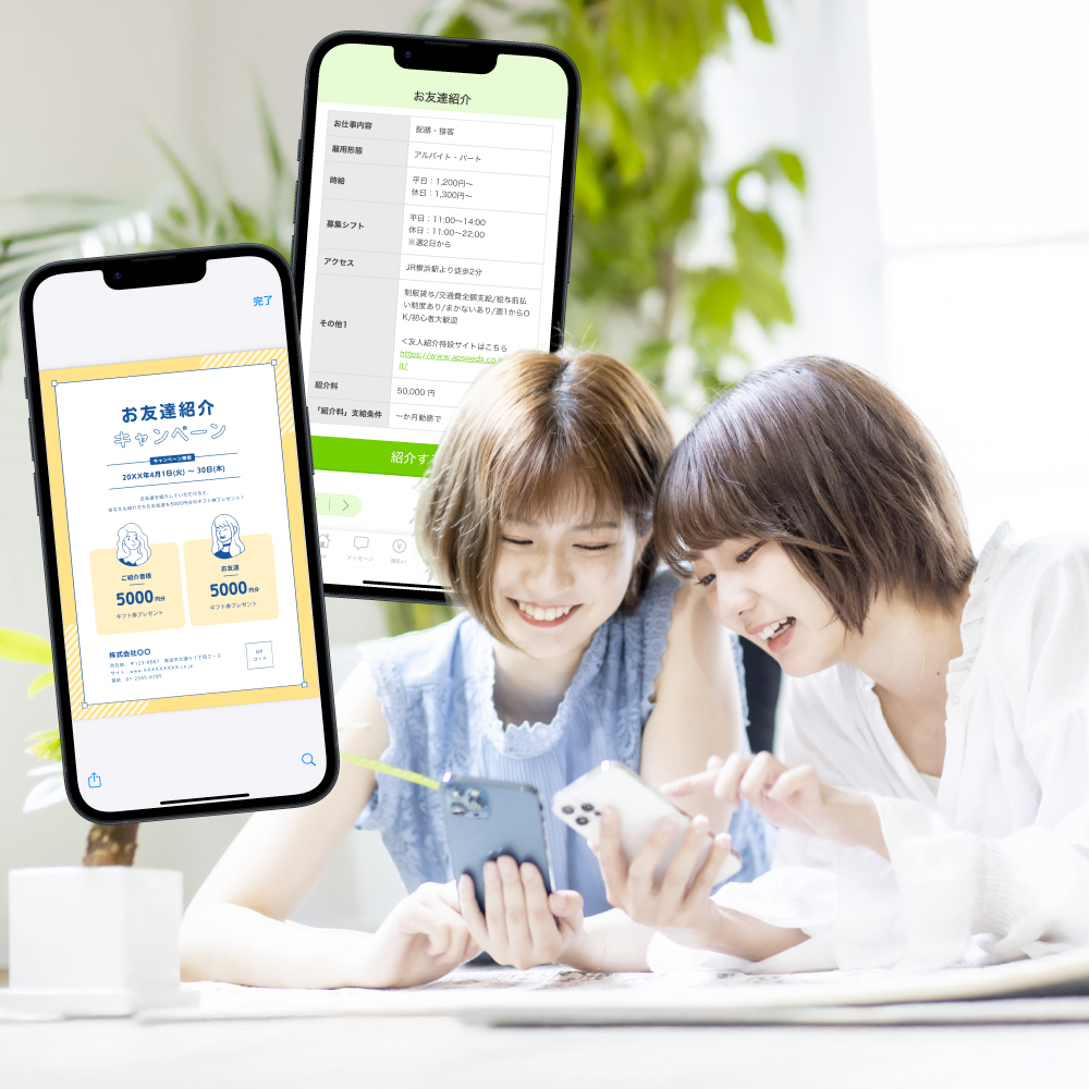 スタッフが友人・知人に「お仕事情報」を紹介できる機能や、退職者とコミュニケーションが取れる機能を搭載。